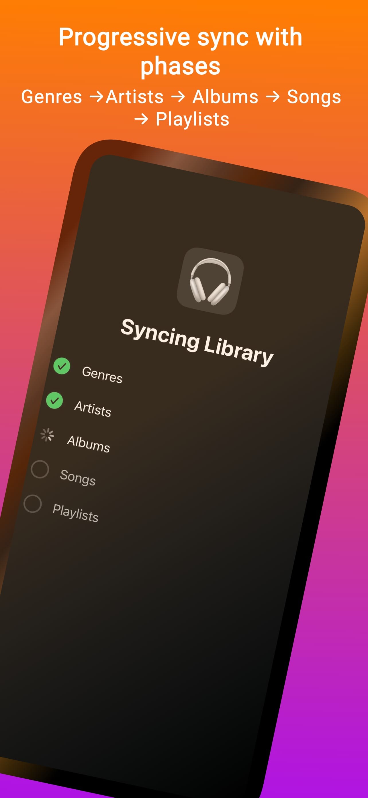 - Sync Strategy - BeatsX implements a progressive sync with phases (genres → playlists → artists → albums) with checkpoint recovery and memory monitoring.