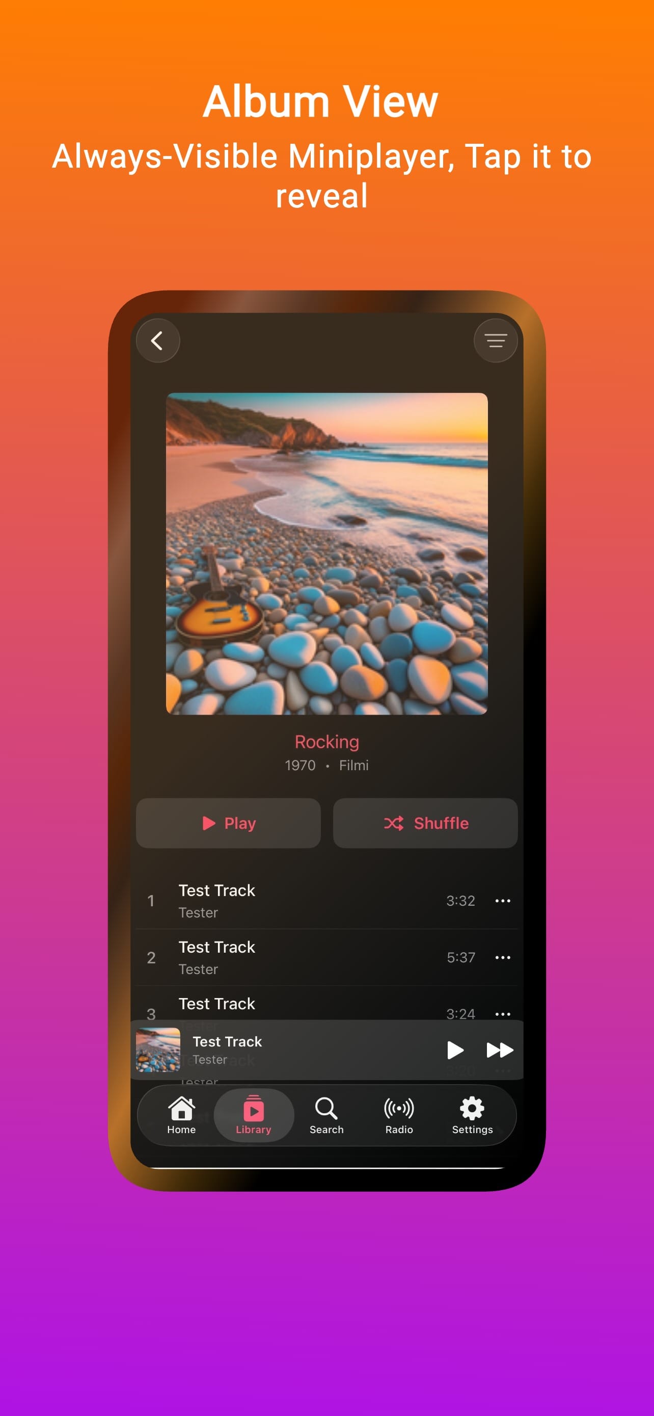 - Always-Visible Miniplayer - A sleek miniplayer stays accessible across the app. Tap it to reveal a fully animated Now Playing screen with delightful zoom-in and zoom-out transitions.